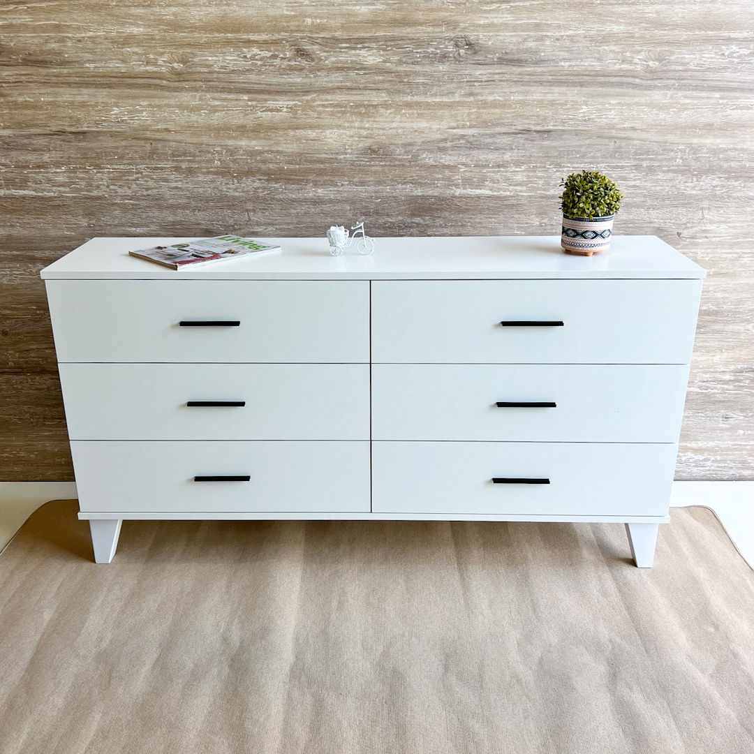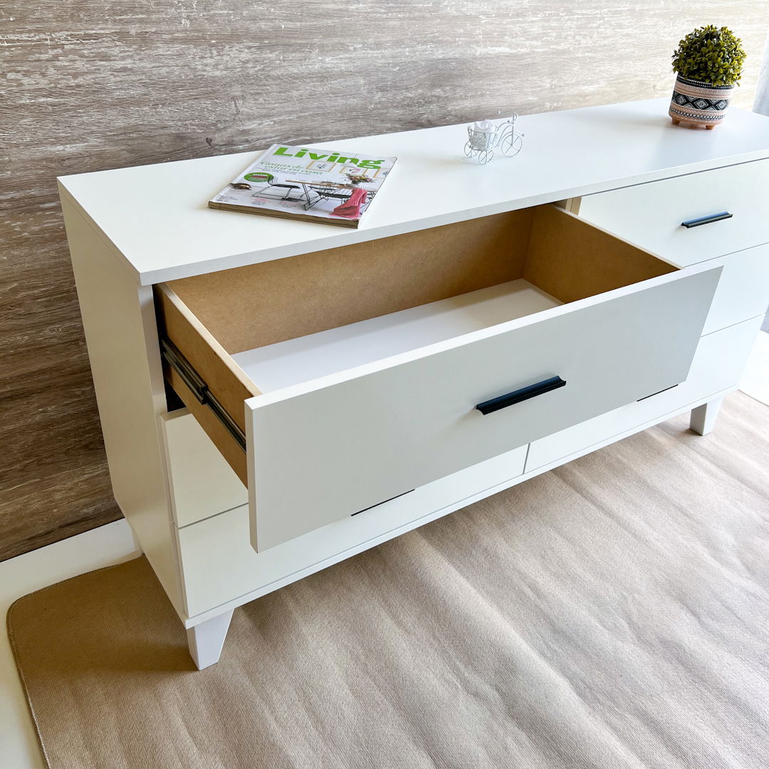 Materiales: Melamina blanca 18 mm, patas en madera pintadas blanca, manijas metalicas color negro.