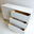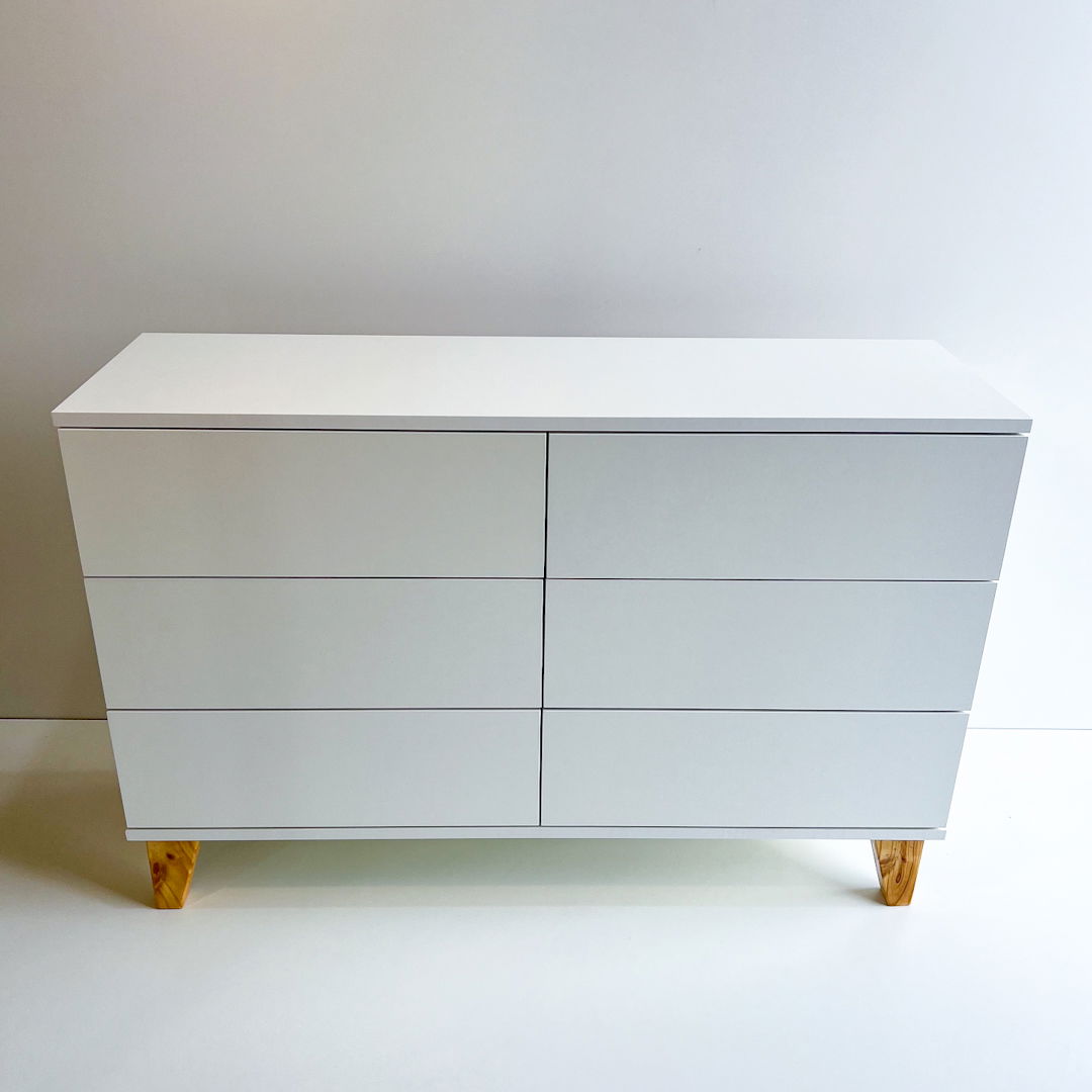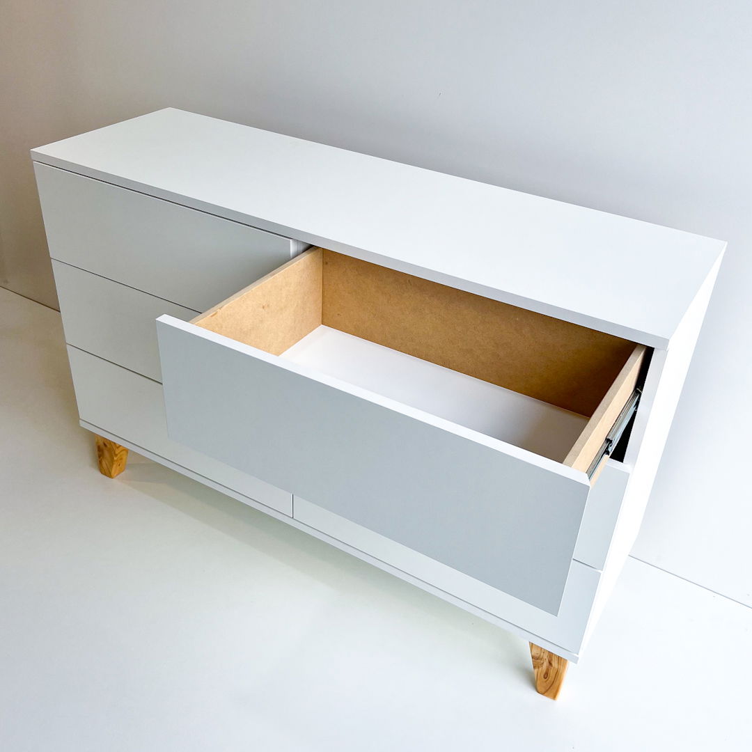 Materiales: Melamina blanca 18 mm, patas en madera, cajones con guias telescopicas.