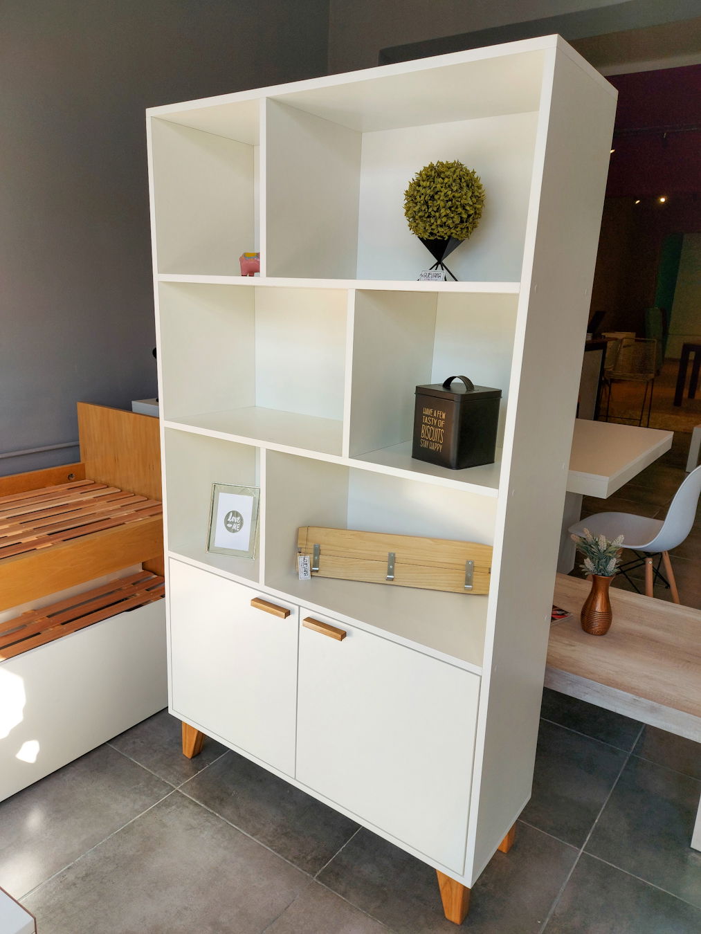 Materiales: Melamina blanca 18 mm, tirador y patas en madera.