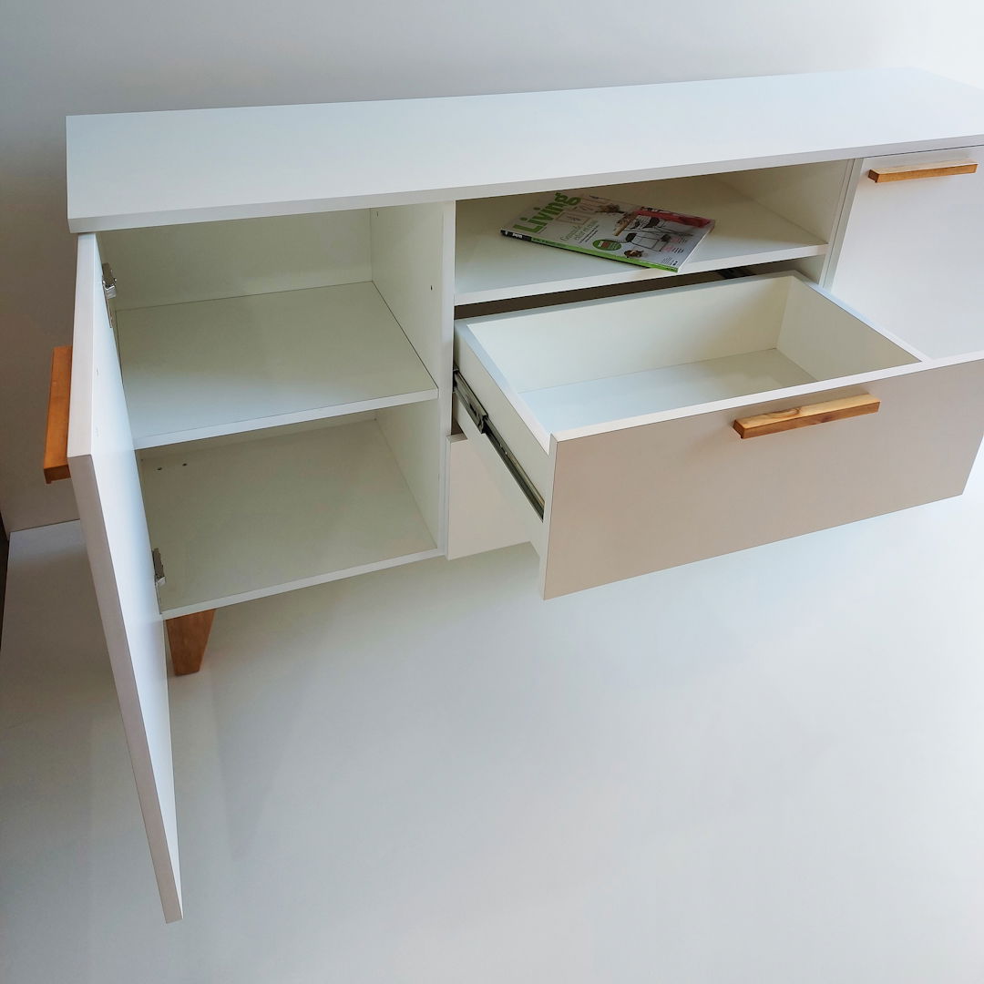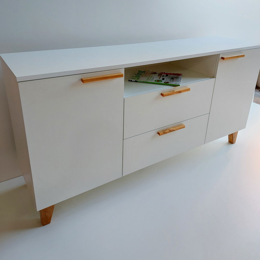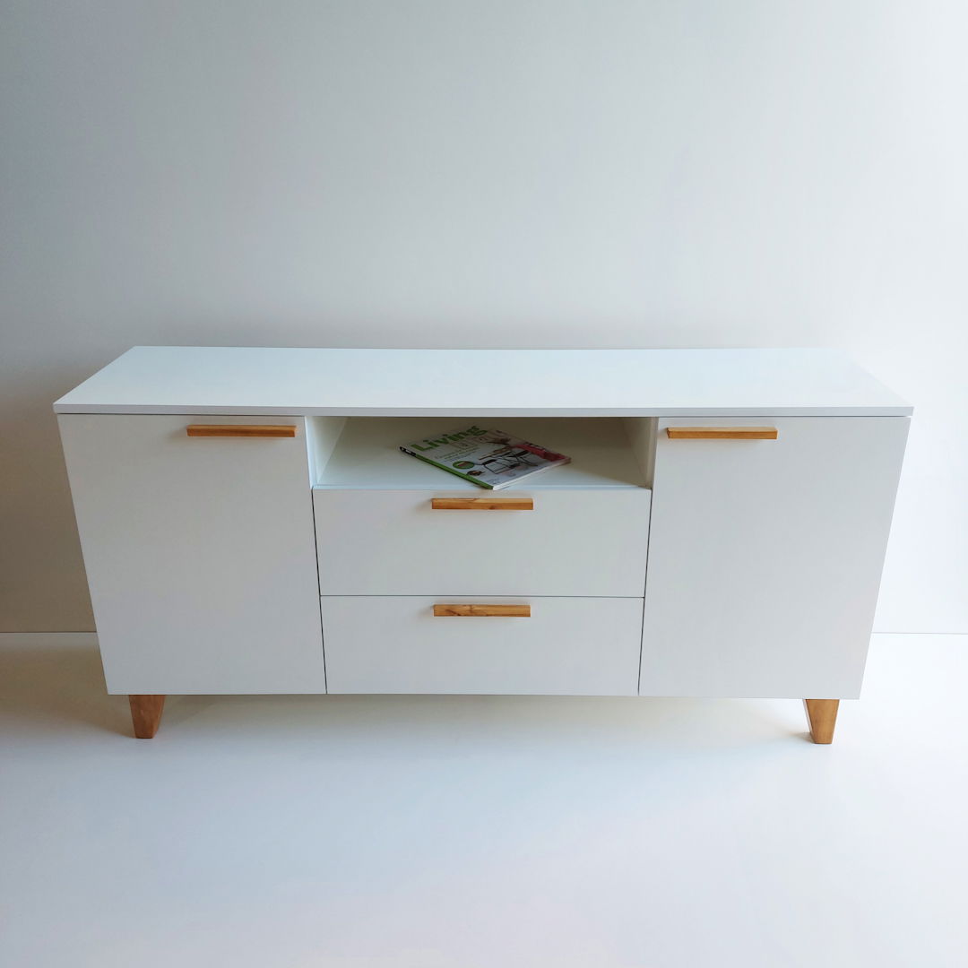 Materiales: Melamina blanca 18 mm, tirador y patas en madera, guias telescopicas en cajones.