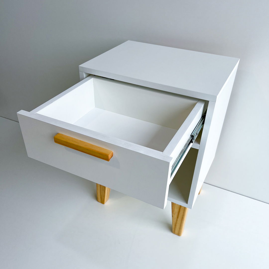 Detalle: Hermoso modelo nordico de mesa de luz, 1 cajon con guia telescopica + espacio abierto.