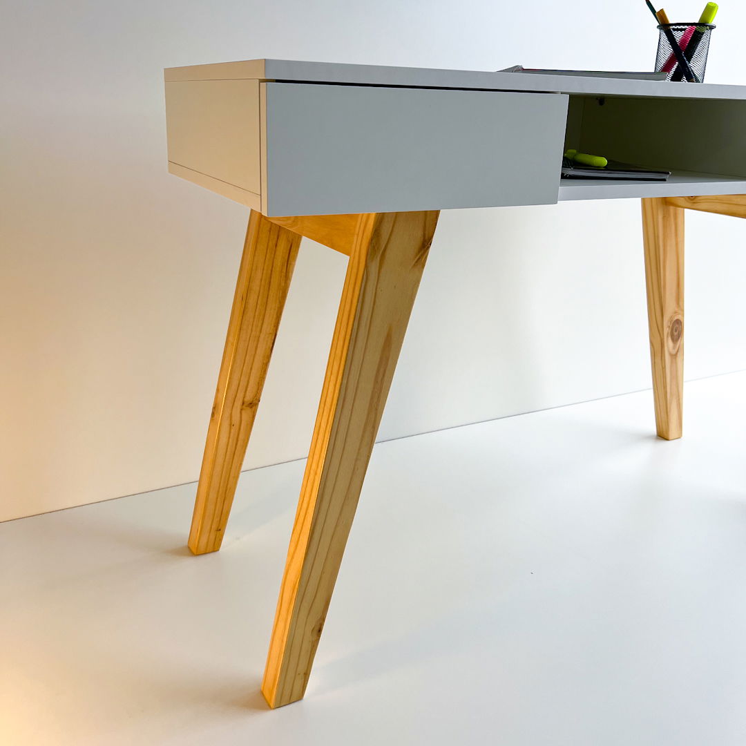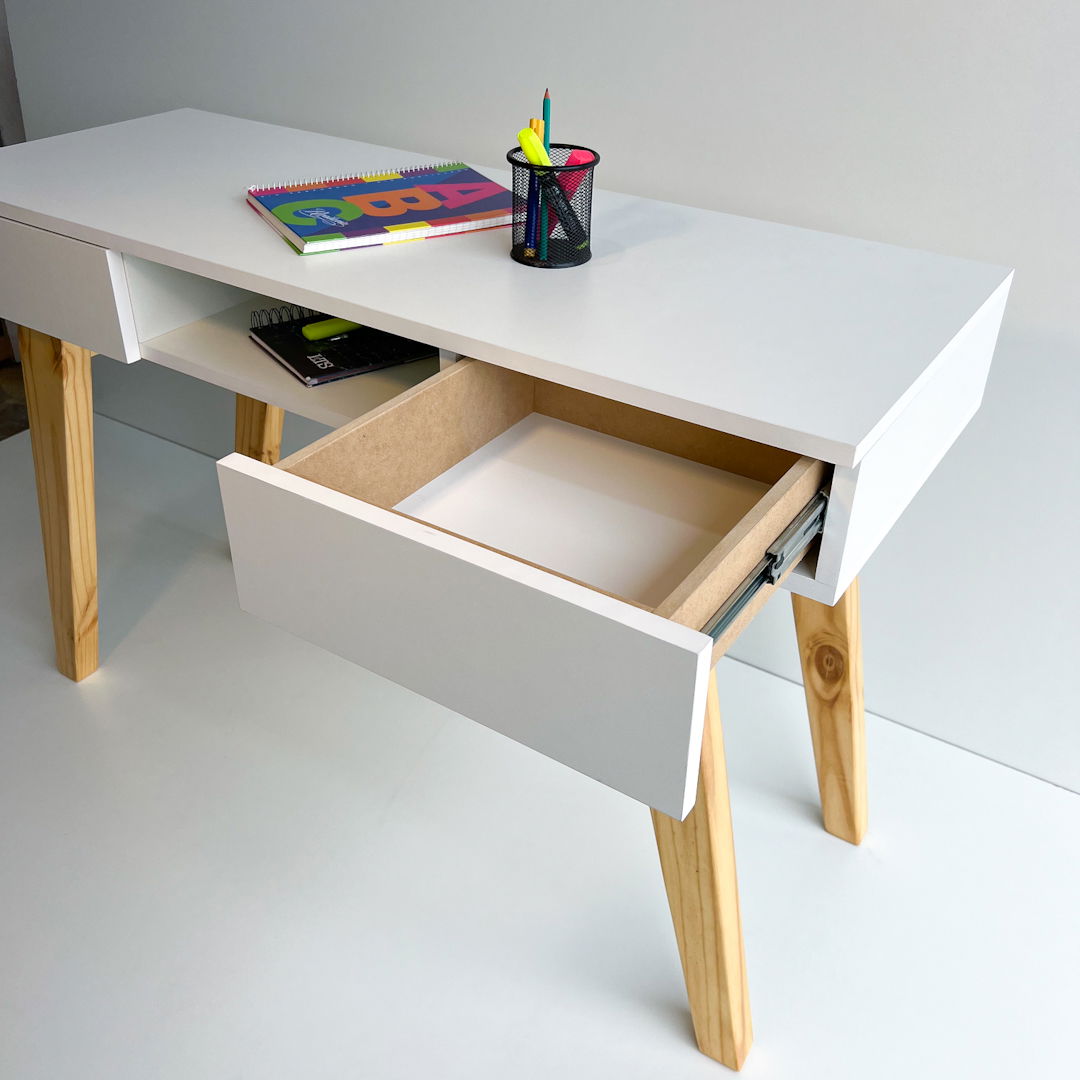 Materiales: Melamina blanca 18 mm, patas en madera, guias telescopicas.