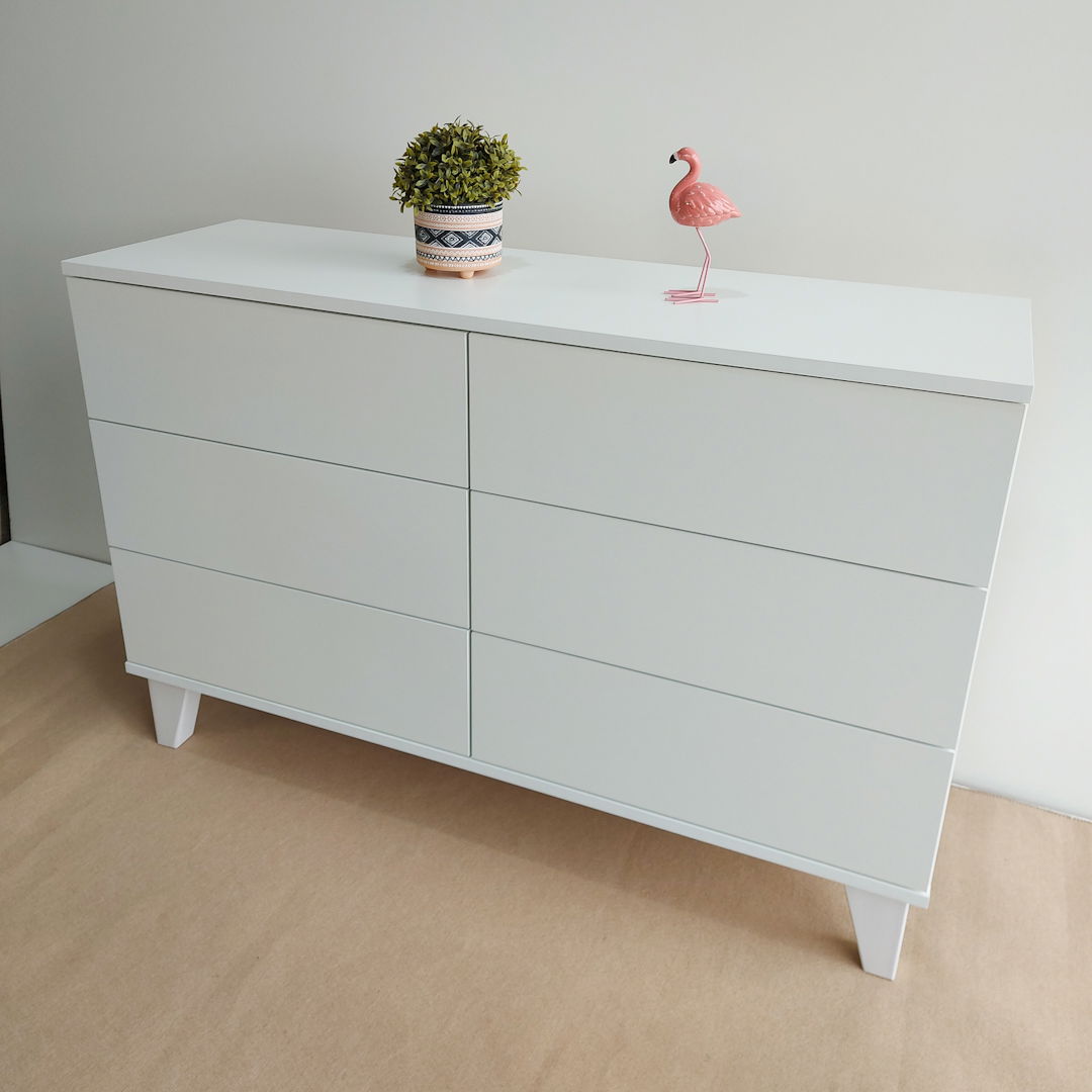 Detalle. 6 cajones con guias telescopicas, apertura en sus laterales a 45 grados, patas en madera pintada de blanco.