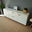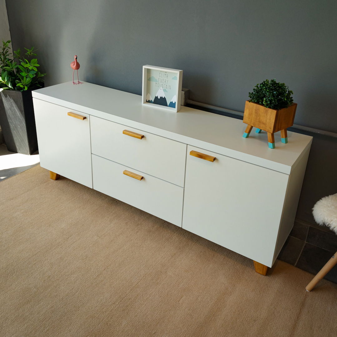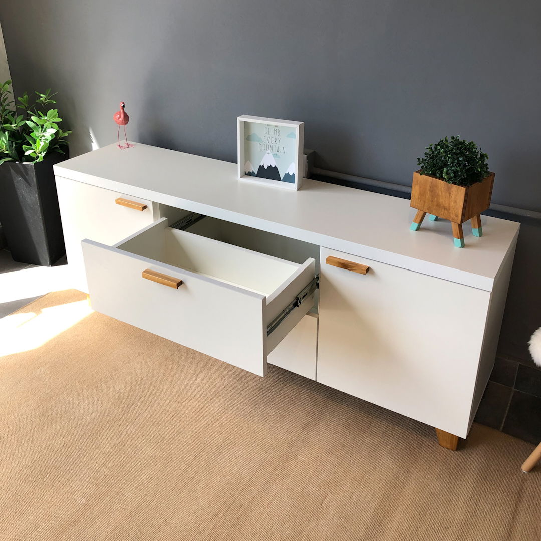 Materiales: Melamina blanca 18 mm, cajones con guias telescopicas, patas y manijas en madera.