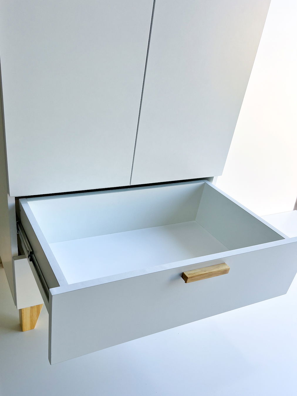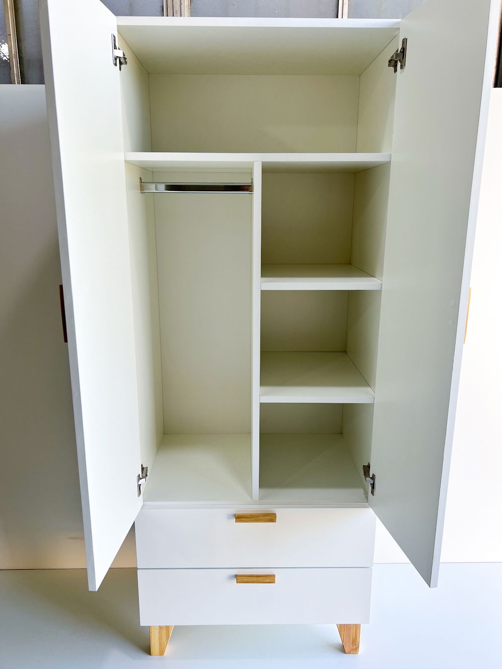 Detalle: 2 puertas de abrir, 4 espacios de guardado y barral para colgar, 2 cajones con guias telescopicas.