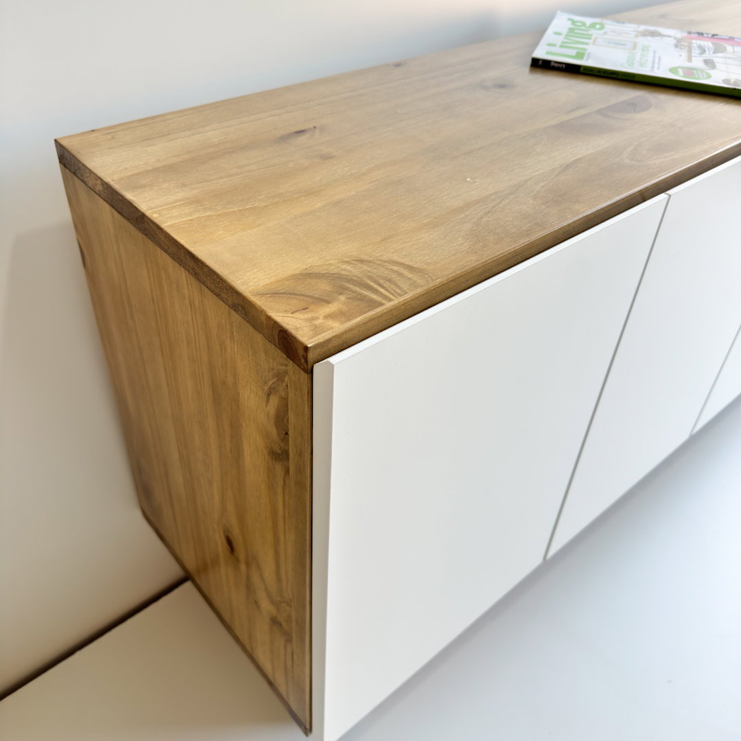 Materiales: Estructura en madera de pino lustrada color petribi al igual que las patas.
